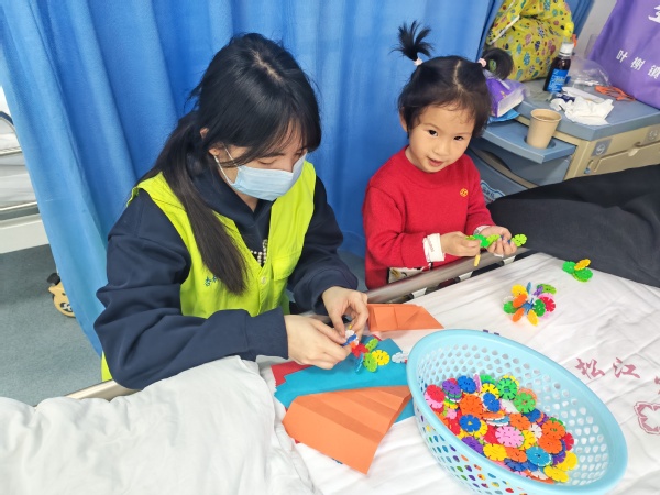 “医路童行”志愿服务团队坚持每周四下午走进医院儿童病房,以“游戏陪伴”为核心,通过搭积木、读绘本、手工制作、趣味互动等方式,为住院患儿送去温暖与欢笑,有效缓解病痛与焦虑,守护童真、助力康复。志愿者用耐心与爱心践行志愿精神,展现青年学子热心公益、乐于奉献的责任担当。