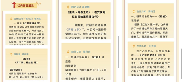 各系紧扣专业特色,搭建假期“充电赋能”平台。同学们或是制定个性化学习计划,在Python、手绘等技能练习中夯实专业基础;或是参与“生涯探索”线上辅导,通过霍兰德职业测试等工具,探索个人兴趣与未来方向;或是在阅读与分享中,从《红星照耀中国》等红色著作里汲取信仰力量。一场持续40天的“幸福日常”打卡活动中,两百余名同学用照片与文字记录出游、阅读、团圆的瞬间,在彼此分享中学会从日常中发现意义,为新学期的学业与成长锚定方向。
